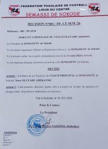 Après 10 matches sans victoire depuis le 21 décembre 2025, l’entraineur de Sémassi FC, Olufadé Adékanmi, est limogé hier lundi par le comité exécutif du club avec effet immédiat.